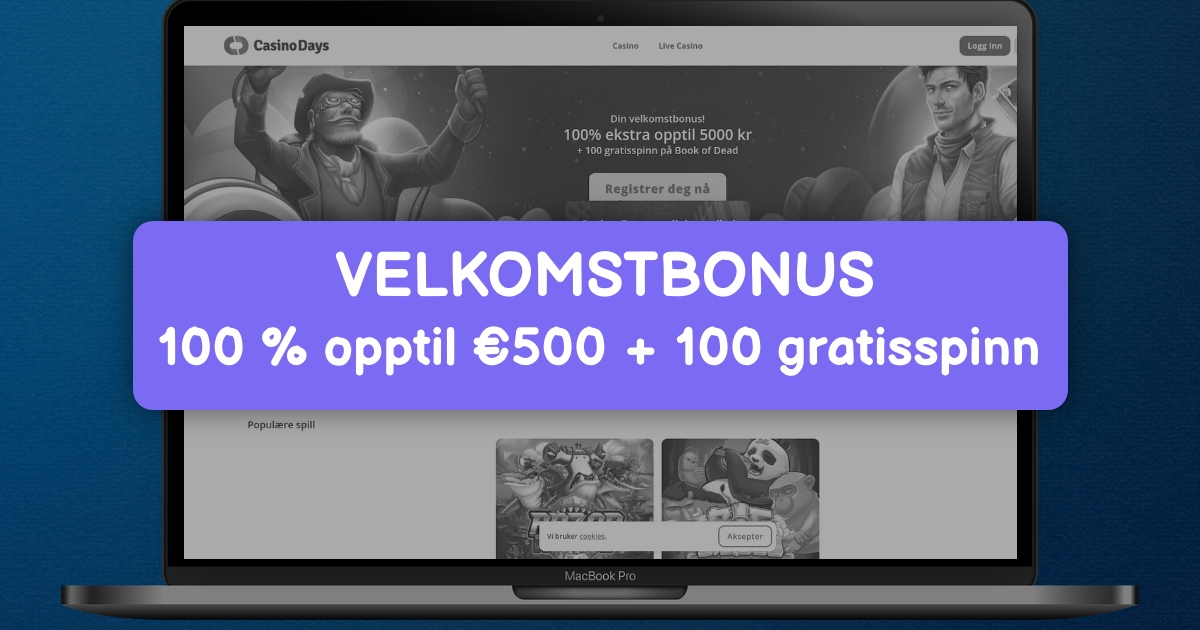 Casino Days tilbyr 100% opptil 5 000 kr på første innskudd med 100 gratisspinn på Book of Dead. Tilbudet aktiveres uten bonuskode etter registrering. Bonusen er gyldig i 7 dager fra kontoopprettelse. Uttak krever omsetning på 35x bonus. Eksempel for 1 000 kr bonus gir 35 000 kr i samlet innsats før uttak. Se alltid vilkår på offisiell side for dette kasinoet. Kilden er kampanjesiden [1][3].